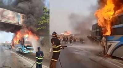 महाराष्ट्र के वडगांव में शनिवार को 36 यात्रियों को ले जा रही एक निजी बस में भीषण आग लग गई। एक अधिकारी ने बताया कि यह हादसा मुंबई-पुणे एक्सप्रेसवे पर...