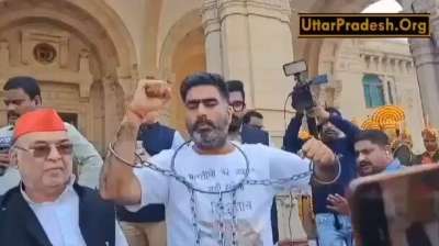 सपा विधायक हाथ पैरों में जंजीर पहनकर प्रदर्शन किया