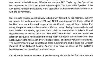 नई दिल्ली। लोकसभा में विपक्ष के नेता राहुल गांधी ने प्रधानमंत्री नरेंद्र मोदी को पत्र लिखकर सरकार से बुधवार को लोकसभा में नीट मुद्दे पर बहस कराने का अनुरोध किया...