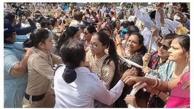 प्रदेश कांग्रेस अध्यक्ष जीतू पटवारी के बंगले पर प्रदर्शन, भाजपा नेत्रियों ने पोस्टर फाड़े