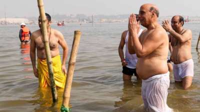 रक्षा मंत्री राजनाथ सिंह ने त्रिवेणी संगम में डुबकी लगा कमाया पुण्य