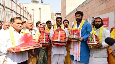 वाराणसी में उत्सवी माहौल, टीका और पुष्पवर्षा से हुआ स्वागत
