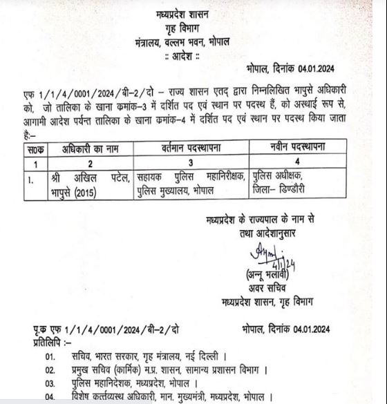 रिक्त पद पर मध्य प्रदेश शासन गृह विभाग द्वारा नियुक्त आदेश जारी किया गया है। 2015 बैच के आइपीएस अधिकारी अखिल पटेल को डिंडौरी पुलिस अधीक्षक की कमान सौंपी गई है। वर्तमान में अखिल पटेल सहायक पुलिस महानिरीक्षक पुलिस मुख्यालय भोपाल में सेवाएं दे रहे थे। बताया गया कि वे शीघ्र ही डिंडौरी आकर पदभार संभालेंगे। वर्तमान में अतिरिक्त पुलिस अधीक्षक जगन्नाथ मरकाम पुलिस अधीक्षक की जिम्मेदारी संभाल रहे हैं।