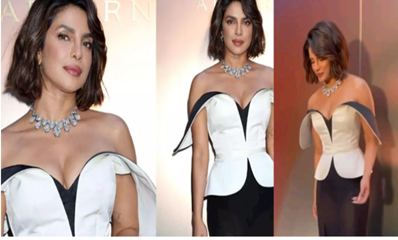 बुल्गारी इवेंट में देसी गर्ल पूरे विदेशी अवतार में नजर आईं। उन्होंने क्रीम और ब्लैक कलर का ऑफ-शोल्डर गाउन पहना था। इस आउटफिट के साथ उन्होंने सर्पेंटी एटर्ना नेकलेस के साथ अपने लुक को पूरा किया।