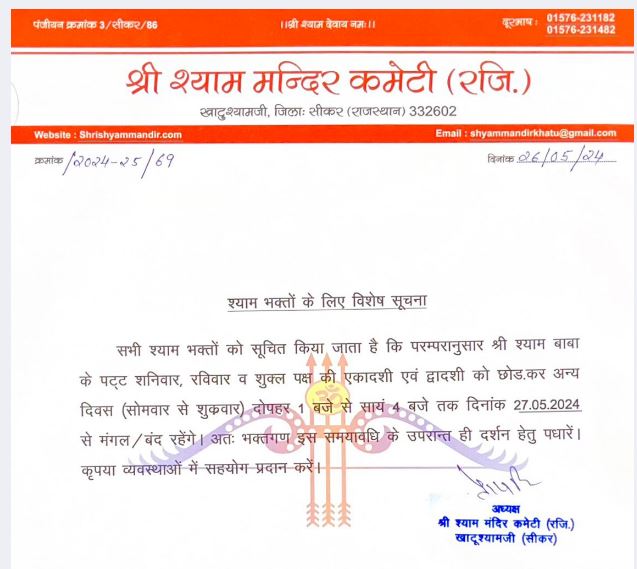 सीकर । श्री श्याम मंदिर कमेटी द्वारा भक्तों के लिये विशेष सूचना जारी की गई है। इस सूचना में बताया गया है कि श्री श्याम बाबा के पट्ट शनिवार, रविवार व शुक्ल पक्ष की एकादशी एवं द्वादशी को छोड़कर सोमवार से शुक्रवार दोपहर एक से चार बजे तक 27 मई से बंद रहेंगे। इसलिए भक्तगण इस समयावधि के उपरांत ही दर्शन के लिये जाये। श्री श्याम मंदिर कमेटी खाटू श्यामजी सीकर ने भक्तों से इस दौरान व्यवस्था बनाये रखने की अपील की है।