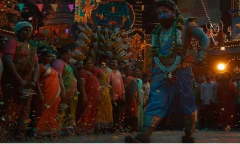 'पुष्पा 2' के टीजर की शुरुआत में एक आलीशान मंडप तैयार दिखता है. हजारों लोग त्रिशूल लिए और सिंदूर उड़ाते नजर आते हैं. फिर पैरों में घूंघरू बांधे और आंखों में काजल लगाते अल्लू अर्जुन का रौंगटे खड़े कर देने वाली झलक दिखती है. कान में झुमका खनकाते, माथे पर तलवार से बिंदी पर कट बनाते और त्रिशूल लेकर शंख बजाते अल्लू अर्जुन स्क्रीन पर आते हैं. टीजर में साड़ी पहने, गले में नींबू की माला और चेहरे पर नीला रंग लगाए अल्लू अर्जुन एक्शन अवतार में दुश्मनों की पिटाई करके आगे बढ़ते दिखाई देते हैं.